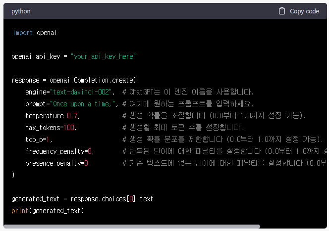 이제 OpenAI API를 사용하여 챗 gpt를 호출할 준비가 되었습니다. 아래 예제 코드를 사용하여 텍스트 생성 요청을 보낼 수 있습니다.