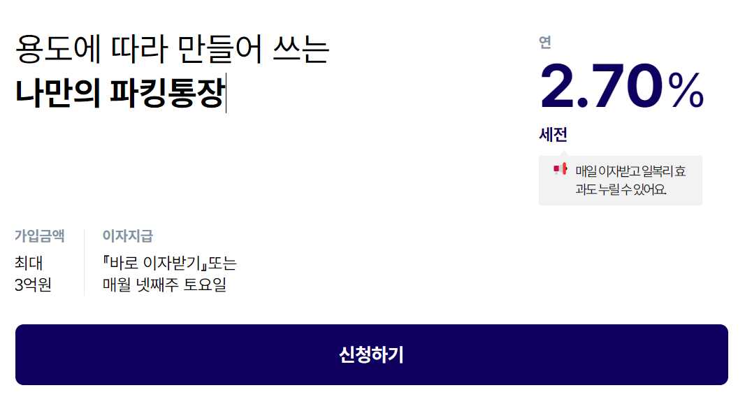 케이뱅크 파킹통장의 적용금리는 연 2.70% 입니다. 이자는 일자별 최종 잔액에 대하여 약정된 금리를 적용한 일별 이자를 합산하여 계산됩니다. 이자지급일은 매월 넷째주 토요일이며, 이자지급일이 도래하기 전이라도 최초 예금일(또는 지난 이자지급일)부터 『바로 이자받기』 신청 전일까지의 이자를 바로 받을 수 있습니다. 이 예금으로 이자가 입금되며, 이자 입금 후 예금의 잔액이 가입금액 한도를 초과하는 경우 초과금액은 연결계좌로 자동 입금됩니다. 단, 적용금리는 케이뱅크 홈페이지 및 케이뱅크 앱 고시에 따라 변동할 수 있으니, 최신 정보를 확인하시기 바랍니다.
